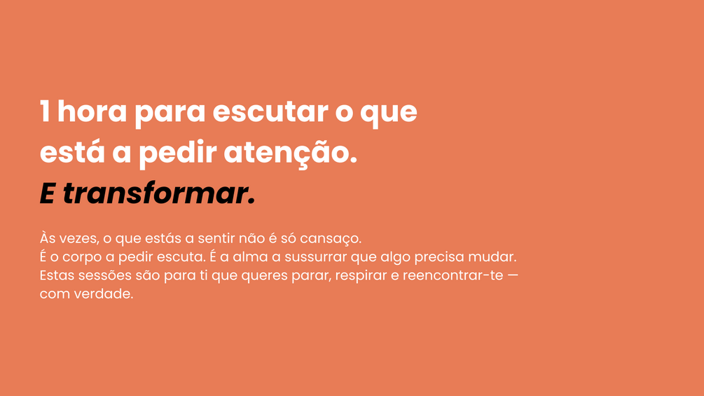 Vamos explorar juntos os teus sintomas — dores, cansaço, insónias, tensão — e a ligação emocional que os alimenta.